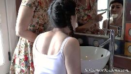 | Scene 3B - The second part of this punishment features the dreaded mouth soaping for these two naughty girls. They are each mouth soaped by the good lady and then taken over her lap in the bathroom for another over the knee spanking with the taste of soap still present in their mouths. Afterwards, they are taken upstairs for the traditional bedtime spanking. PURCHASE CLIP HERE |